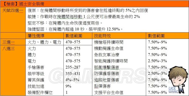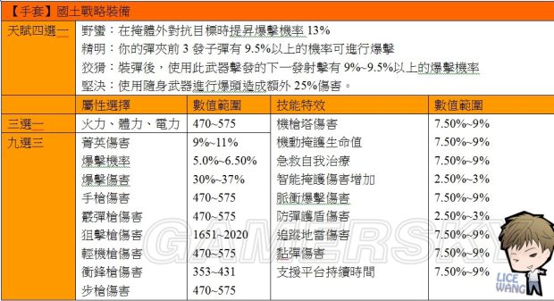 天赋效果、火力、体力、电力表格内由上至下是蓝、紫、金