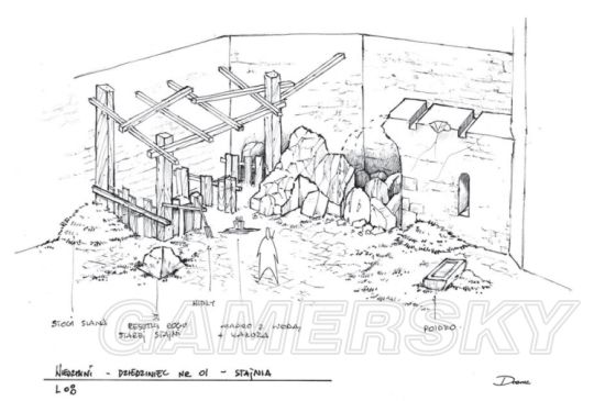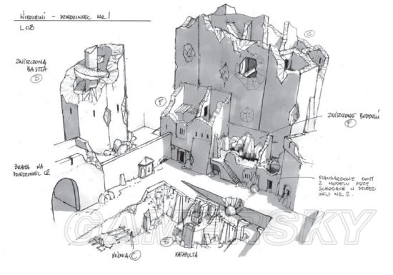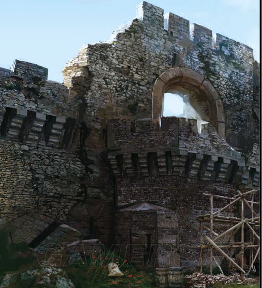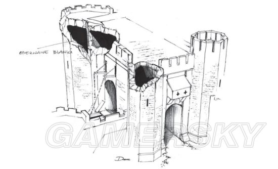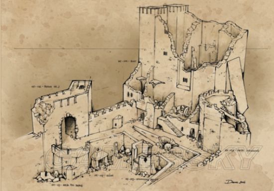 在下边的一系列设计图中我们可以看到,城堡从最初的草图雏形演变成游戏中最终的样式,他们在逐步建模的过程中添加了很多细节,包括地上的坩埚、桶、箱子和碎石块。并且制作出能忠实的反映城堡的风景和环境。