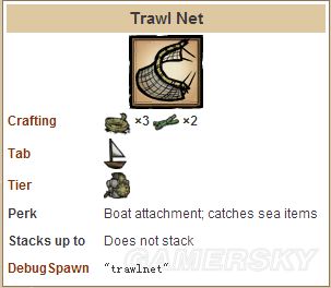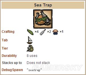 类似普通陷阱,在水中放置诱饵用以诱捕龙虾,可使用8次,龙虾在网中两天后死亡。