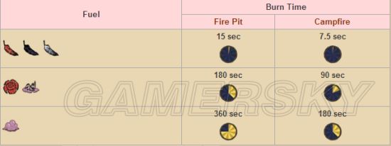 第一列即是燃料,第二列是在火坑中的燃烧时间,第三列是火堆时间,第四列黑曜石火坑时间