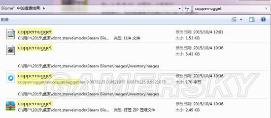 你可以在游戏中找到“铜块”,他的英文是“copper nugget”,然后在整个mod文件夹里搜索“coppernugget”,注意,最好不要带空格,带空格可能搜不到