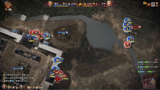 守城图:比野战不同的是,注意利用门口的两架床弩,在城下堵人。藏身在桥右侧,等一帮人过去之后冲出去。