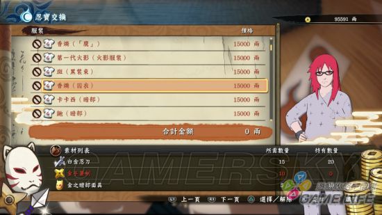 “收藏”则能以持有的金钱与忍宝交换各式各样的收集要素,除了在连线对战模式中会用到的“忍识卡”相关编辑要素外,另外也能购入角色们的服装模组与特殊语音。而在其他的游戏模式里收集到的终结特写画面与名号也能在“收藏”中进行确认,随时追踪收集的进度。