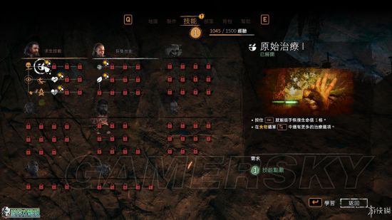 本作同样拥有十分完备的技能系统,不过得先找到对应的专家并且完成任务之后才能解锁某一个类别的技能。通过任务与狩猎获取的经验值积累之后可以获得技能点数,之后可以有侧重的来令自己的角色获得成长。技能树最后当然是能够全开的,不过得完成几乎全部的任务才能做到了。