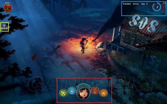 右上方篮框则是日期、探索距离、温度和天气情况。