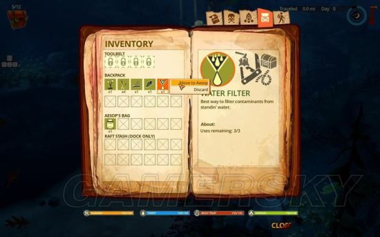 红框为主角背包空间、篮框为小狗背包、黄框为木筏存储空间(只能在码头使用)。