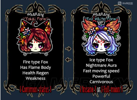 4、替换脑残为妖气,晚上不会降低,打怪时巨幅下降,低于一定值会变为白狐,变为白狐后攻击力,移动速度都会增加,月圆之夜也会变身,变身期间之内只能吃肉,会对对他造成伤害的生物冻伤。
