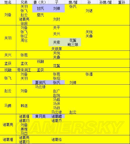 1. 孟获与孟优,祝融与带来洞主,诸葛亮、诸葛瑾与诸葛均为Lv1兄弟;关兴与张苞,马腾与韩遂为Lv4义兄弟;其他为五级绊;刘备、关羽与张飞为Lv4义兄弟与五级绊并存。