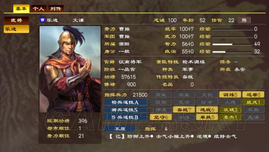 四:自己的重臣特性也作用于自己身上,比如:乐进,他的重臣特性为枪兵调练,但他的枪兵适性为A,当乐进作为君主,都督,太守,以及相应的军事重臣时,他的枪兵兵种适性就会上升到S