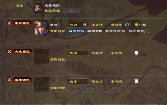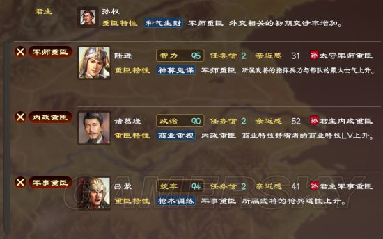 重臣:君主可委任军师重臣、内政重臣以及军事重臣,不同的武将拥有不同的战略特性,有的具备神鬼算谋,有的则更加重视商业发展。