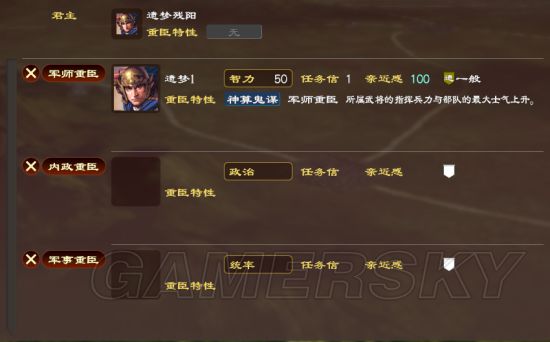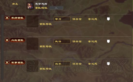 重臣负责执行任务,君主、太守和都督都能提出建议。重臣功绩达到10000就能成为太守。