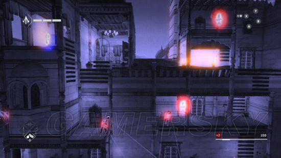 即使只是横版2.5d,本作还是做到了精确还原刺客信条系列的跑酷动作,最基本的冲刺,越过障碍物,爬墙,蹬墙,反向跳都还原了,本作甚至加入了类似于启示录里的滑索;潜行方面,可以做出下蹲和滑行的动作,动画都很流畅;除上述以外,还有上梁、摆荡和爬杆,可以让玩家体验到传统AC以外的跑酷和潜行模式。