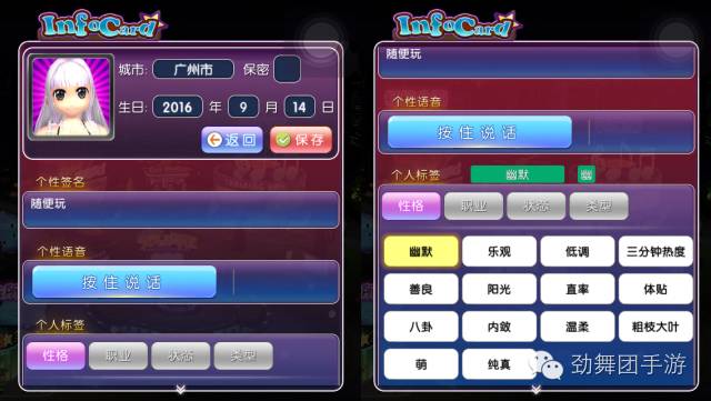点击【按住说话】就可以录音之后别人查看名片就可以听到你的语音了哦~惹,《劲舞团》手游里面的声控还是挺多的!说不定宝宝你的一句话就能迷倒对方了!