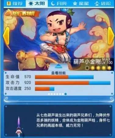【葫芦小金刚】:主动使用后与友机停止弹幕射击,进入免伤状态,召唤七色葫芦娃参战,秒杀范围的敌机,并对Boss或首领造成每秒240000伤害(双打模式440000),持续13秒。技能开始和结束时均造成清屏爆炸,累积最高造成3620000伤害。冷却时间300秒(乐斗模式下,持续时间与伤害减半)。