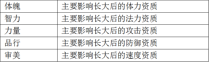 值得注意的是,每种童年属性都会或多或少地影响多种资质,但不同属性主要影响的资质却是不同的。下面咱们看看影响各资质主要受哪些属性影响。