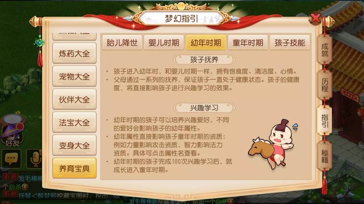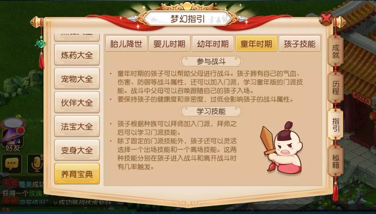 童年期子女就要拜入门派,选择什么门派取决于子女各方面的资质,而资质则和幼年期的培养息息相关,因此,从幼年期开始,你就必须要为子女的童年期做好准备了。比如,一个方寸山子女,如果你没有给它很高的速度资质,那子女拜入方寸之后的战斗能力就十分有限了。