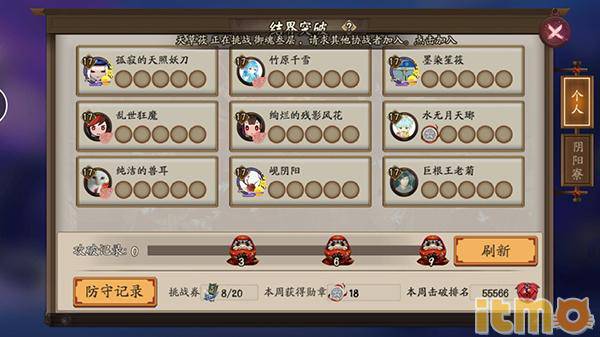 在个人结界突破的界面中,一共有9个玩家的结界。玩家可以消耗突破符(并不消耗体力)来突破其他玩家的结界。