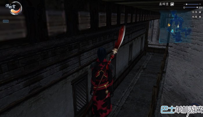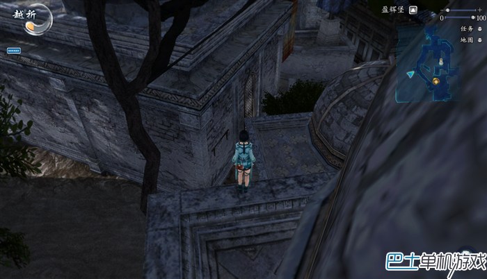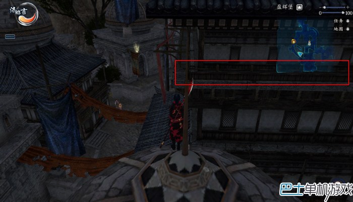 沿着墙壁走到背面后来到上图位置,跳到左侧平台上