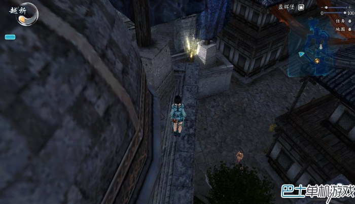 上图所示位置为起点,跳上圆形屋顶然后跳上对面方形尖角位置,沿着墙壁可以跨过木头栏杆