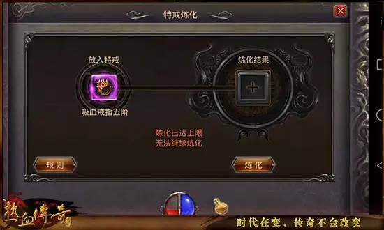 特戒可以炼化,两个一样的特戒可炼化成更高一级的特戒,比如两个一级麻痹戒指炼化成一个二级麻痹戒指,炼化是百分百成功的。炼化后特戒技能释放的几率增加,涉及的属性值也增加。