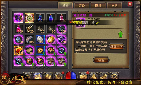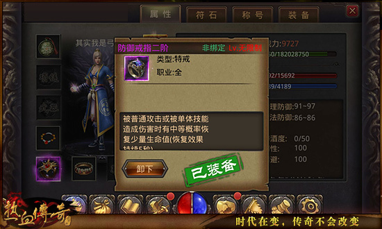 防御型特戒吸血戒指:在攻击的时候恢复自己血量防御戒指:被攻击时有几率恢复生命值复活戒指:有几率在死亡的时候直接复活并恢复一定的血和魔回复戒指:有几率恢复一定量生命值