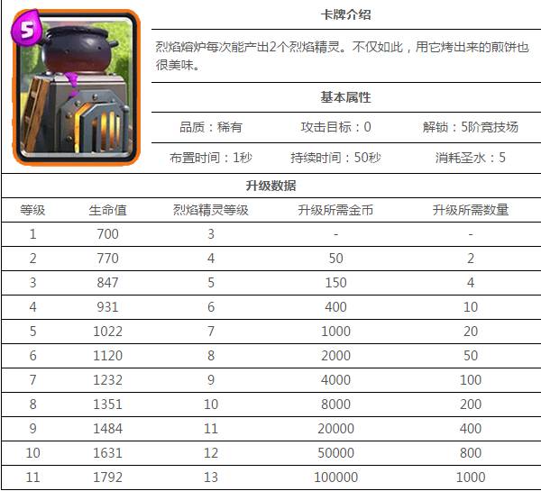 烈焰熔炉是解锁于五级竞技场的一张建筑卡,其本身血量可观,不次于野蛮人房子。在战场上主要作用是每间隔10秒生产出两个烈焰精灵,精灵本身比熔炉等级高2级。