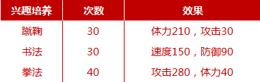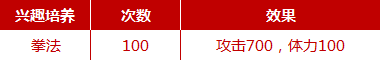 直接100次拳法,如果在健康度没有出现问题正常情况下会加攻击资质,这样培养出来的孩纸输出极其爆表,而且拳法也会增加1点的体魄,等于说会有100点的体力资质,所以生存能力也不会很差。