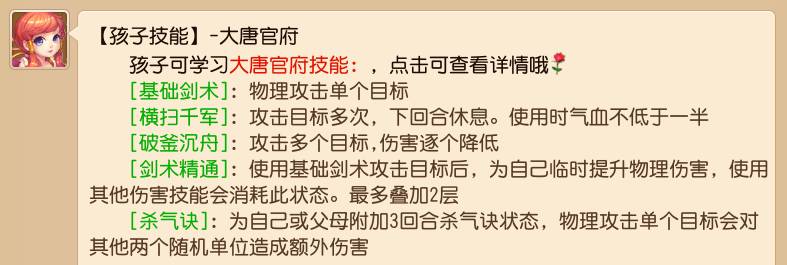 对于物理输出单位还是很给力的,在对战中还能合理利用孩纸的杀气诀技能,特别是大唐门派,其次在对战中我们还可以依靠他的速度优势来充当一个卡速来补给己方。入场技能和离场技能可以和暴力输出型孩纸选择一样的技能,致命一击和百折不挠。