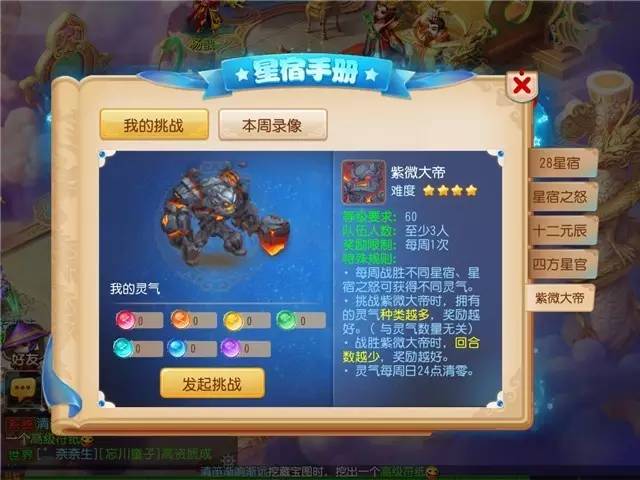 成功挑战紫微大帝的回合数越少,以及当时所拥有的灵气越多,奖励就越丰富,因此想获得丰厚奖励的小伙伴,记得先去挑战其它星宿任务,然后争取速战速决哦!