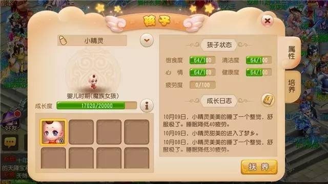 首先我们来看一下婴儿期:婴儿期属性分为饱食度、清洁度、心情、健康度、疲劳度五大属性。其中饱食度、清洁度、健康度每小时会降低2点,而进行喂食、洗澡、逗乐操作,会提升子女的这些属性和成长值,但同时也会提升子女的疲劳度,一旦疲劳度到达100就不能进行除睡觉以外的其他操作了。这些操作有一定的时间间隔,其中:
