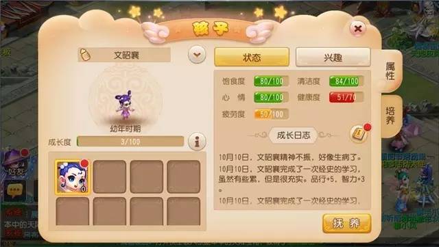 也就是说,想要最快速地成长,除了睡眠时间外,最好应该2小时培养一次子女。在子女成长度超过100点(也就是培养100次)后子女进入童年期。