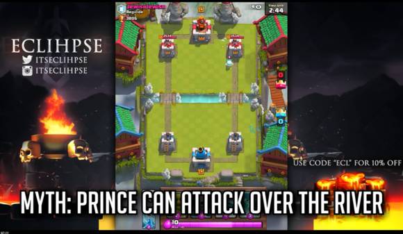 结论:王子可以攻击到!这个技巧在实战中非常实用,例如当对方的远程部队在河道边上借助射程攻击你的建筑压制你,放一个王子分分钟教做人