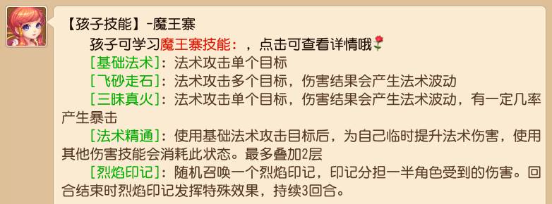 该类型的魔王孩纸属于高速型孩纸,能快过对方的输出宝宝出手,利用自己的爆发力掌握战斗的先机,同时也有不错的输出能力,唯一的缺陷就是生存能力不足,PVP时很难站稳脚跟。不过在武神坛和擂台赛中有不少团队利用魔王的烈焰印记来配合孩纸,大家可以借鉴一下。