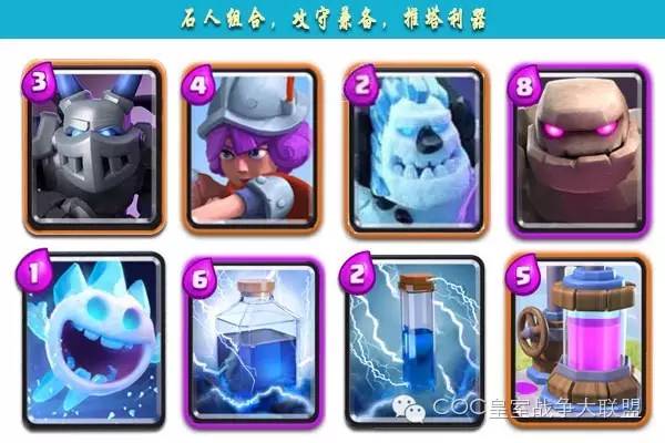 此外它还可以用来牵制巨人流卡组中的支援部队,让你可以集中火力先对付巨人。戈仑冰人被消灭后将会带来减速效果,这样又能让你更快地干掉剩下的敌人。另外在配合空中部队时,戈仑冰人可以吸收来自地面部队的伤害,此时你的重甲亡灵/地狱飞龙等部队就可以轻松地向前推进。