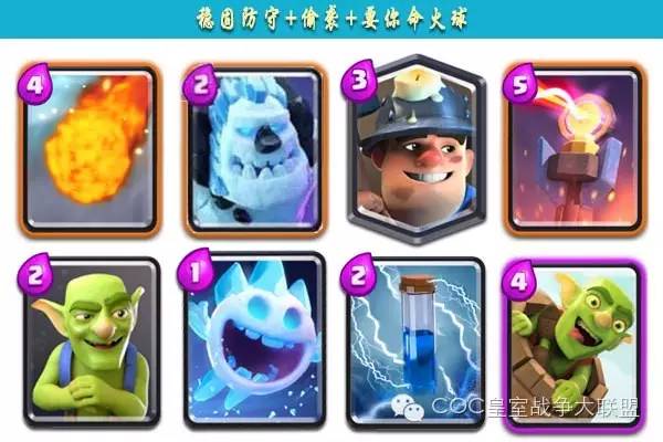 戈仑冰人+矿工+哥布林飞桶+哥布林+冰雪精灵+小闪电+火球+地狱之塔