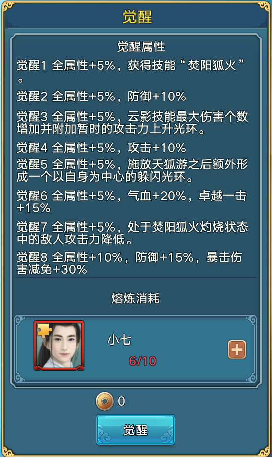 小七觉醒属性小七的觉醒属性大部分都是防御类的,小七的防御属性就比其他的属性要高,所以防御的增幅还是不错的。觉醒8的小七可以有效的降低暴击带来的伤害,存活的几率大大增加。