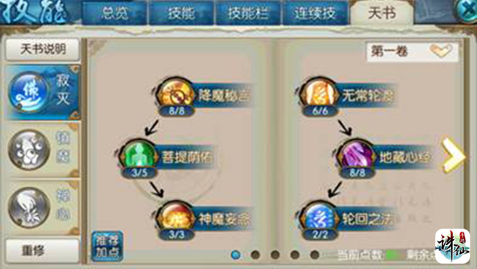 第一卷:降魔秘言4级,无常轮渡4级,菩提荫佑3级,地藏心经8级,神魔妄念3级,轮回之法2级。(24点)