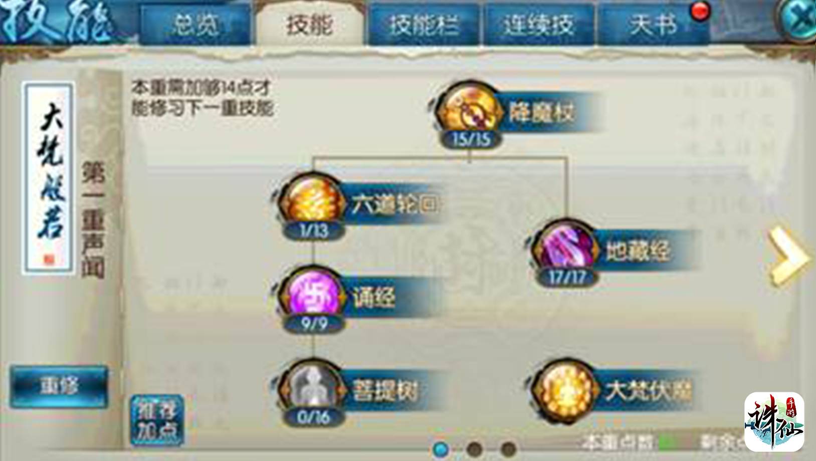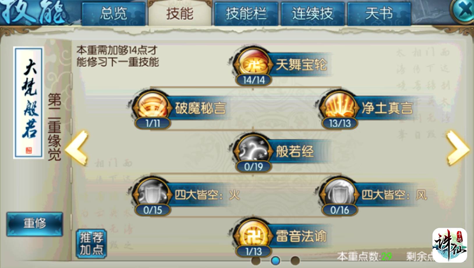 第二重:天舞宝轮满14级,破魔秘言1级,净土真言满13级,雷音法谕1级。(29点)