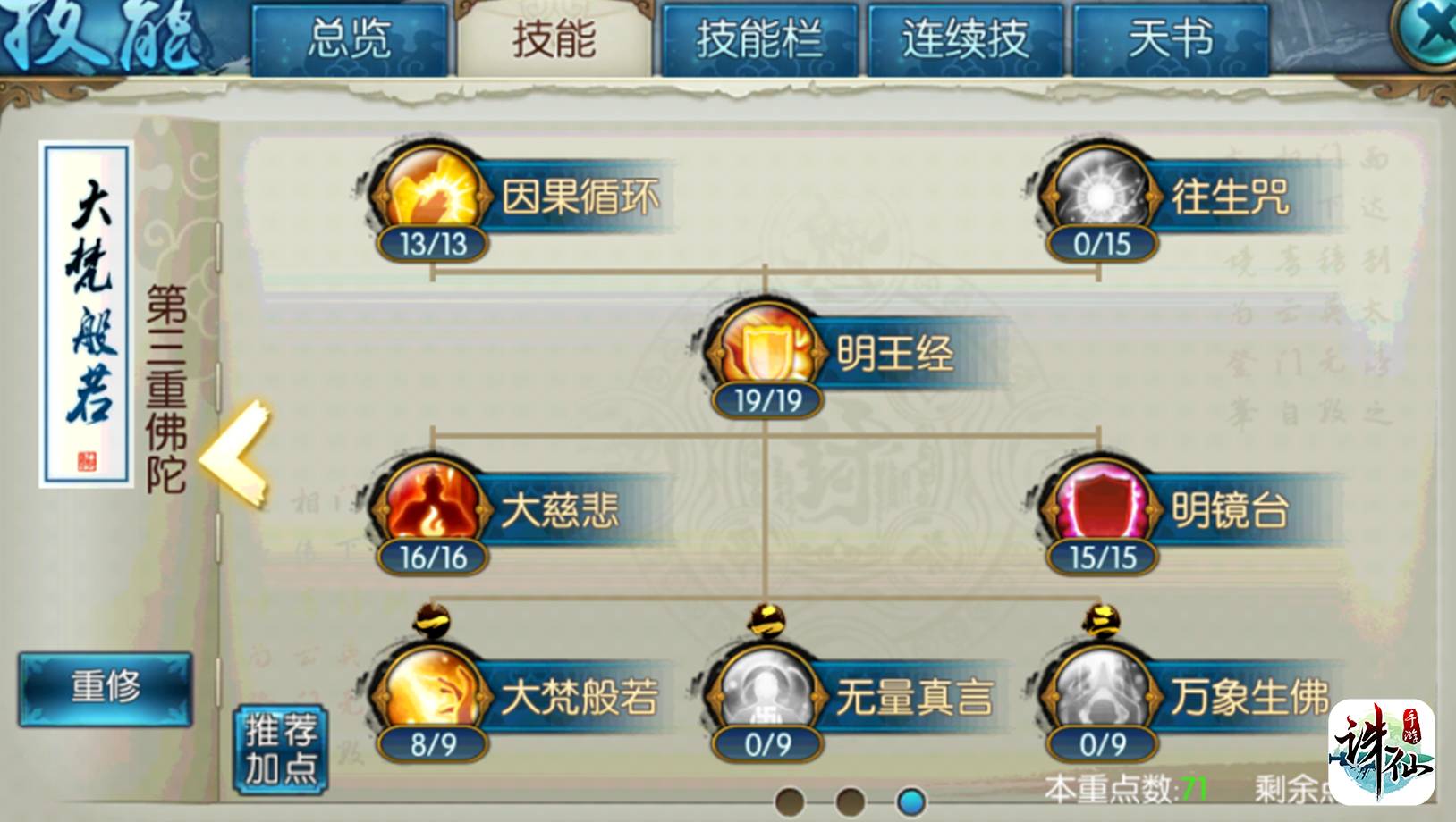 第三重:因果循环满13级,往生咒1级,明王经满19级,大慈悲满16级,明镜台满15级,大梵般若满9级。(73点)
