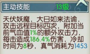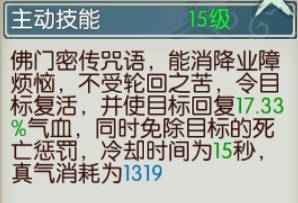 往生咒:满级往生咒回复17.33%气血,加上天书16%的加成,刚好三分之一的气血,加上复活后用的血药和天音的净土,基本能恢复到正常血量。
