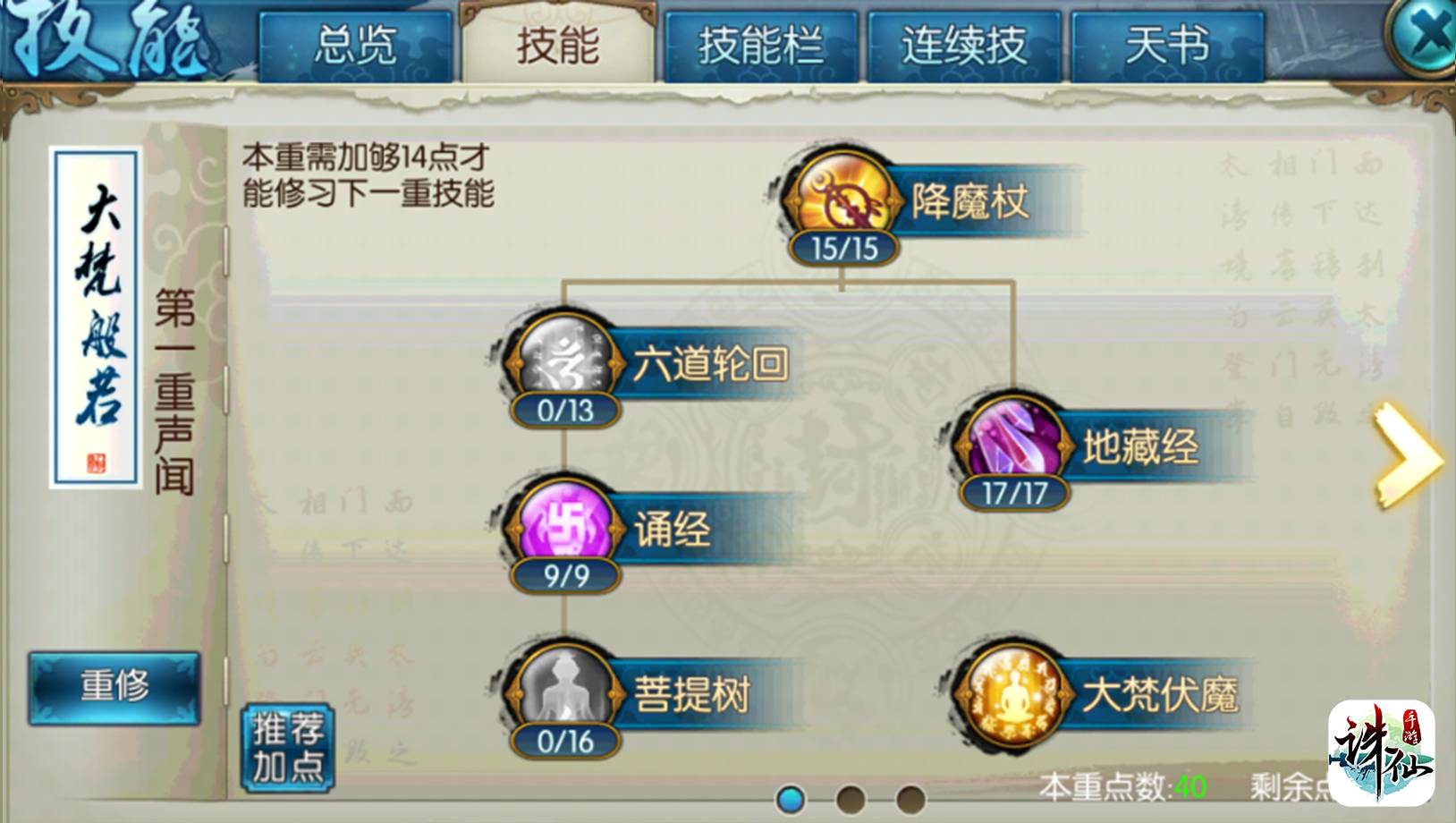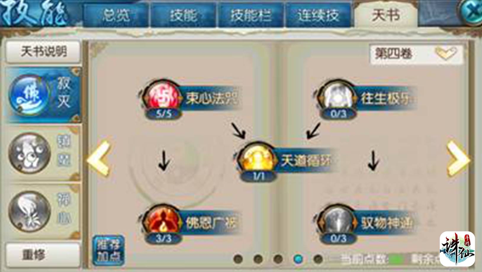 分析:因为是通用加点,所以兼并输出,加血,辅助能力,降魔仗和地藏经满配合天书,最大化提升命中;六道这次我放弃了是因为我使用了很长一段时间,感觉六道伤害真心不高,比普攻多点,释放一次六道我都可以打两轮普攻了,所以放弃了;菩提树因为天书第五卷暂时还没开启,等天书第五卷开启时可以考虑将降魔仗和地藏经的点加到菩提树,用命中换暴击;破魔1级解控,往生咒1级加天书够用了,其他该加满的也满了。第五卷天书开启后,左边一列偏攻击,右边一列偏防御,看个人选择。