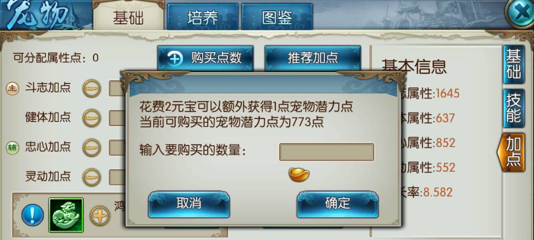 属性加点的话也很灵活,看你偏向什么属性以及宠物的成长和资质。比如宠物资质和成长比较均匀的话,可以3主2辅或4主1辅,宠物成长和主资质很高,辅资质很低的情况下,可以全主加点;宠物除了升级得到的属性点,还可以通过元宝购买属性点,1点属性2个元宝,有上限,感觉不是很贵,后期可以尝试培养。估计有一些人不知道这点,所以提出来。