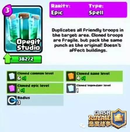 ➤ 克隆药水,史诗卡,建筑除外,可复制出药水所在范围的一切部队,也就是x2的效果,复制出来的镜像比较脆弱,但伤害很足,貌似对建筑无效。