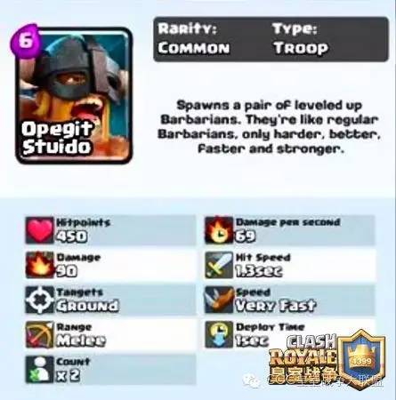 ➤ 暴走(精装)野蛮人,普通卡,一次出2个,6点水,从视频上看速度非常快,攻击输出较高,但是血量不足,有点像野蛮人届的哥布林,看上去比较好配牌。
