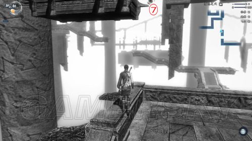 还是老样子,在路沿上走同时注意躲避时空乱流。可以看到一侧圆柱那里的飞跃点“5”。