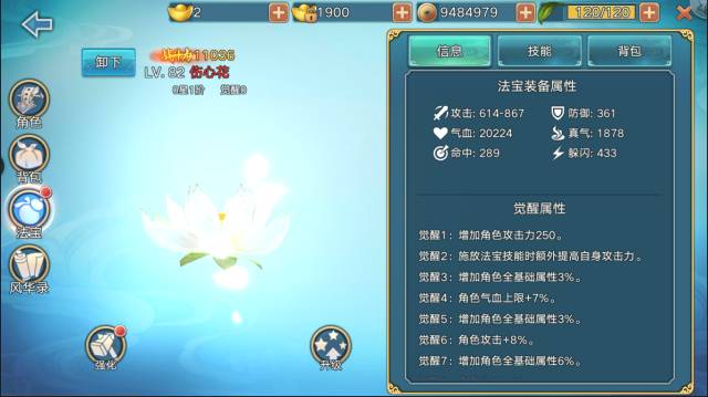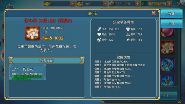 法宝升级分为等级和技能,青云君将1级的伤心花升级到82级,法宝技能等级提升到22级,等级上有了巨大的提升,但是治疗量并没有太大的提升,大约提升了2000点左右。