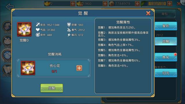 觉醒可以大幅度提升法宝属性,没觉醒的伤心花属性上要比觉醒的天琊剑差了很大一截(两者等级星阶觉醒相同时属性应该差距不大),觉醒之后伤心花治疗效果有显著的提升。