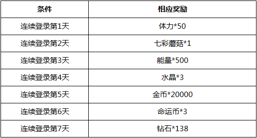 活动期间内,坚持每日登录,即可拿到相应奖励!连续登录第7天的奖励可是138钻石哟~!