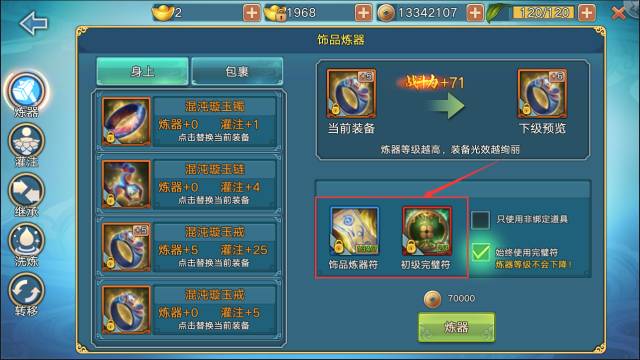 饰品炼器功能需要玩家使用饰品专用的炼器符以及灌注符。炼器同样需要完璧符(注意初级完璧符不要都合成了)。炼器和灌注属性也可以通过继承玩法将炼器属性转移到新的饰品上,所以不用担心新等级还需要洗练。
