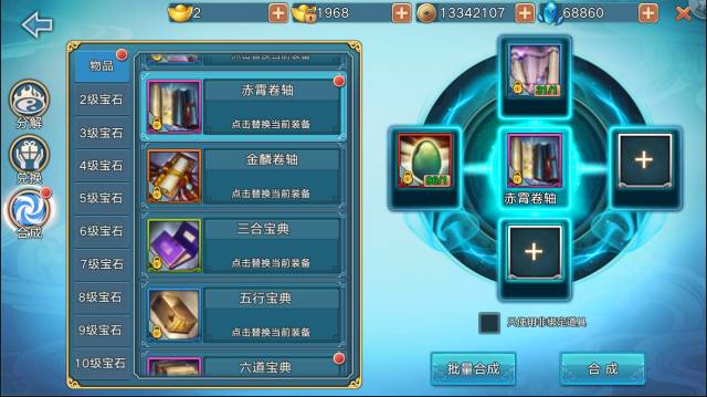 很多玩家可能没有发现,聚宝盆中的合成系统不仅仅能够合成宝石,还可以合成大量的物品,例如说法宝经验丹之类的。这让玩家可以将很多低级的经验丹合成为高级的。以后升级就不需要再多次点击了。青云君觉得最好的地方还是合成高品质的卷轴。低等级的卷轴+仙豆即可合成高等级的卷轴,让低等级的卷轴变的更加有用。而且一个卷轴才消耗一个仙豆,还是比较划算的。